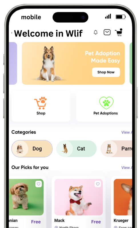تطبيق وليف مجتمع تبني مجاناً، بيع وشراء الحيوانات، متاجر متنوعة، عيادات واستشارات بيطرية
